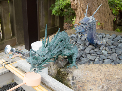 ![]() 龍口のある丸い石造物は、戦前まで井戸として使っていたものを移設しました。 また、後部の龍口は角が破損した時に修理をして御厨に大切に仕舞われていましたが、その御姿を参拝の方々に知っていただけるように、現在の龍口とともに井戸の中央に設置をしています。 |